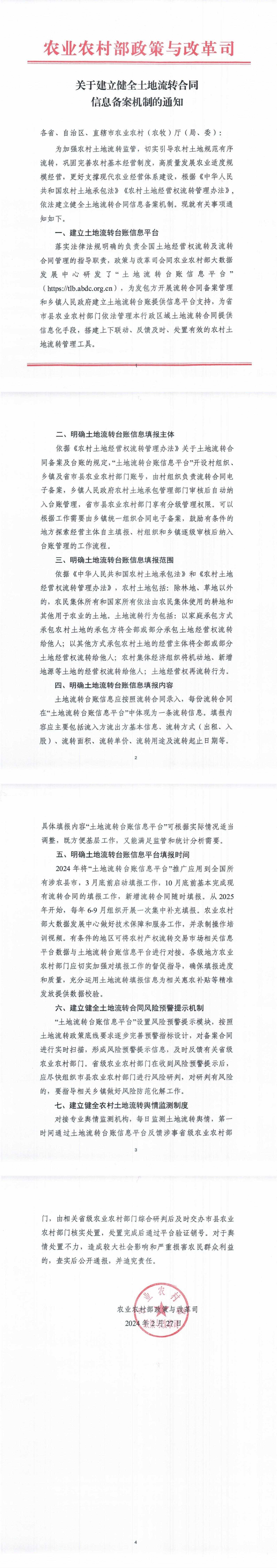 农业农村部政策与改革司 关于建立健全土地流转合同信息备案机制的通知